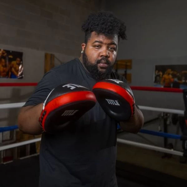 Adjustable, elastic side on the hand compartment for a secure fit and air holes for breathability. Designed with padded “hood” so you don’t’ get jammed fingers and broken knuckles. It allows for better return punches while working on your fighter’s defense.