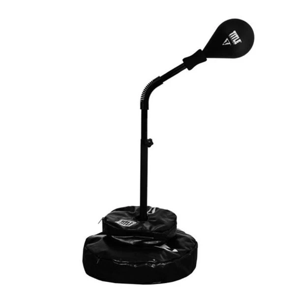 TITLE Lightning Strike Pro Reflex Bag with Anchor – Refine and develop astonishing speed, razor sharp punching accuracy and pin-point precision with the incredible Lightning Strike Pro Reflex Bag. Industrial steel tubular construction is fully adjustable and manufactured for world champions to fitness boxers in the gym and for home training. Professional grade 7.5” high-tension steel spring guarantees blazing speed and lightning fast action. Super contoured, 869 grams sponge-rubber, mid-density 9” striking target offers ideal resistance and superior quality, with no inner bladders or air pump requirements. Simply and easily adjusts from about 4’ (48”) to 6’ (72”) tall to perfectly accommodate every size athlete from youth to super heavyweight. The Lightning Strike Pro Reflex Bag is ideal for honing every punch and strike . . . jabs, power punches, hooks, uppercuts, angled punches, rapid combinations, and more – plus slipping, weaving and defensive drills. Quick and easy assembly. Adjusts simply with a secure turn knob. Innovative design and craftsmanship benefits and advances fitness boxers to professional champions with fantastic training advances, cardio benefits and improvements that win. Secure the vital edge required to win by gaining and perfecting punching speed, accuracy and timing! Now includes four masonry floor anchors for permanent installation into concrete floors, and two unfilled round anchor bags to fill with sand for a more portable freestanding weighted option.